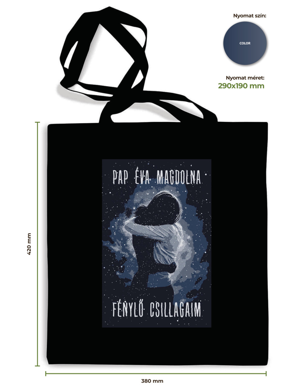 Vászontáska Pap Éva Magdolna: Fénylő csillagaim című könyvének borítójával